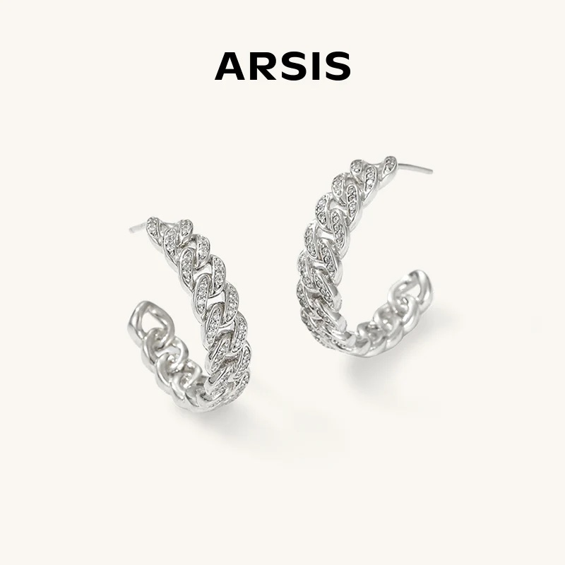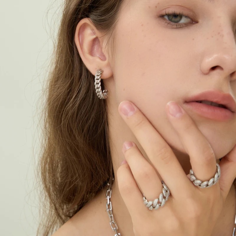 Classic Cuban chain design, trendy and popular this year. Fully studded with sparkling cubic zirconia, exuding a luxurious and delicate charm. Classic C-shaped earrings, perfect for enhancing the contours of your face.